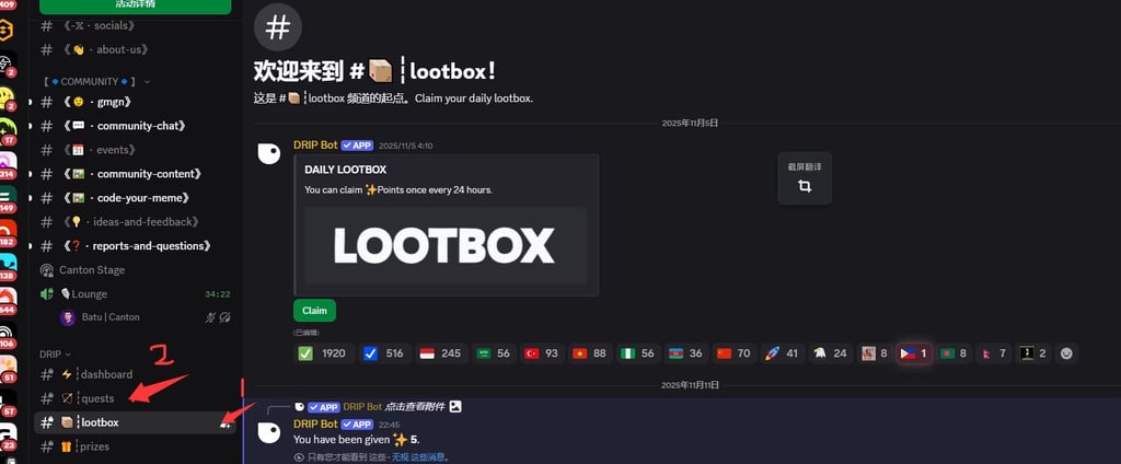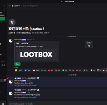 1融资3.9亿美元的新天王 @CantonNetwork 上次错过以后一直没角度参与,昨天终于出新角度了 有两个任务是限时的,看到别懒顺手就做了哦!! 先加入DC 进去以后先通过验证 切换到lootbox频道 点击Claim(每天领取5积分) 切换到quests频道 完成两个限时任务获得30积分(距离结束仅15小时)Dc网址https://discord.gg/M9wWyqry
